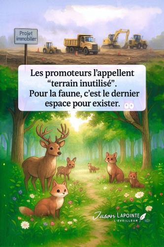 Depuis quelques jours je n'arrivais pas à accéder à internet soi-disant que j'avais consommer tous mes Go ( 1 truc comme ça j'y connais que dalle . Bref je vais regarder chez Orange avant de leur tel et que vois-je ? Des 0.18€ 0.07 € envoyer en 6/7 fois d'un coup depuis mi-octobre jusqu'à hier envoyé Usa Royaume Unis Australie .je les fait bloquer direct et j'ai demandé à changer de n° de tel . Je suis encore a chercher comment ils ont pu faire car je ne paie rien avec mon téléphone. J'étais verte. aussi pour payer autoroute la sécu etc 1 amie hier a reçu 1 mail de sa banque lui disant qu'une grosse somme avait été retirée frauduleusement En réalité tout était faux et en trois jours le pseudo conseiller a prélevé 4 grosses sommes d’argent ,il lui a vidé mon livret de caisse d’épargne. Étonnamment il avait toutes ses coordonnées d’identités et bancaires ! elle court entre sa banque et gendarmerie ! je crois que si ça continue je vais aller vivre sur 1 iles juste avec des bouquin rien d'autre quel monde mon Dieu ! bref bonne soirée à vous toutes :x :x :x :x :x :x :x bises de moua On appelle ça "terrain inutilisé". Mais ce n’est jamais inutile pour ceux qui y vivent déjà. Pour le renard qui élève ses petits. Pour le chevreuil qui connaît chaque sentier par cœur. Pour l’oiseau qui revient au même arbre depuis des années. À chaque fois qu’on rase un boisé pour un nouveau "parc industriel", ce n’est pas juste du terrain qu’on efface. C’est une maison. Une route. Un garde-manger. Une vie entière. La faune n’a pas de plan B. Elle n’a pas de notaire, pas de contrat, pas de déménagement possible. Elle disparaît en silence, pendant qu’on applaudit la "croissance". On peut bâtir, oui. On peut développer, oui. Mais pas comme si on était seuls ici. Parce que dans ces "terrains inutilisés", il y a encore des milliers d’animaux qui essayent simplement d’exister. |